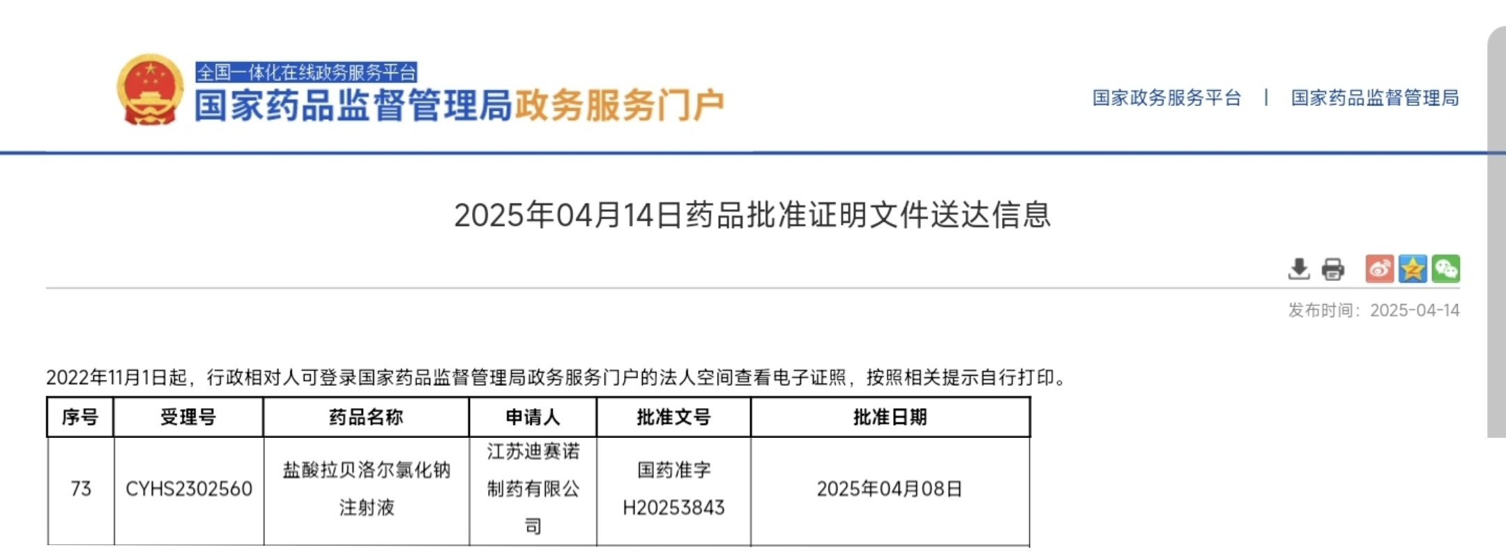 2025年4月8日,荣耀体育网页版_荣耀(中国)的盐酸拉贝洛尔氯化钠注射液(国药准字H20253843)成功获得国家药品监督管理局(NMPA)批准上市,该产品是公司的化药3类仿制药,是该品种药物的国内首仿。这一成果标志着公司在心血管领域的产品布局迈上新台阶,也为广大患者提供了更优质的用药选择。
